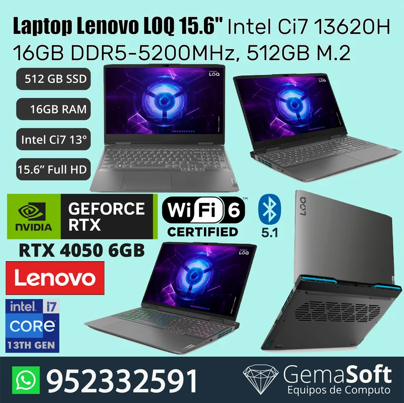 Laptop GAMER Lenovo LOQ, para Arquitectura, ingeniería, diseño grafico y gamer, 15.6″ FHD IPS, Core i7-13620H 2.4/4.9GHz, RAM de16GB DDR5-5200 MHz, Disco de 512GB SSD M.2 2242 PCIe 4.0 x4 NVMe, Tarjeta de Video NVIDIA GeForce RTX 4050 (6GB GDDR6) / Boost Clock 2370MHz / TGP 95W, Audio HD + Realtek ALC3287 Codec / Stereo Speakers 2W x2 / Nahimic Gaming Audio, LAN GbE (RJ-45), Wireless LAN Wi-Fi 6 802.11ax 2×2 + Bluetooth 5.1, Cámara Web FHD 1080p con E-Shutter + Microfono 2x Array, Teclado 4-Zone RGB Backlit, Teclado en español, Bateria Integrada 60Wh, Color Storm Grey (Gris). No incluye Sistema Operativo.
